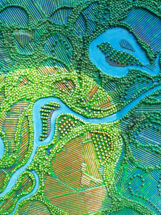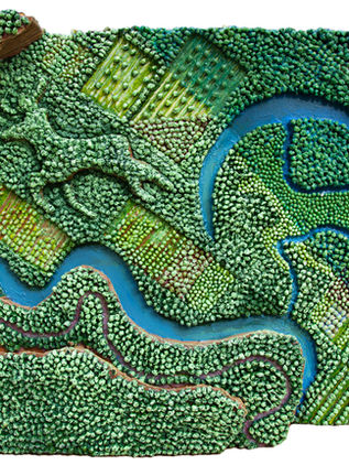 My mixed media relief sculpture series invites viewers to explore an imaginative aerial landscape where the past and present coexist harmoniously. Crafted from intricately layered cardboard, epoxy clay, foil, and acrylic paint, each piece captures contemporary topographical information interwoven with historical elements, including the renowned ancient Mississippi River course map patterns designed by Harold Fisk. These dynamic sculptures feature animal effigies inspired by the ancient Native American Mississippian Culture, seamlessly integrating into the terrain and enriching the narrative of this land. The result is a thought-provoking dialogue between time and geography, prompting reflection on how our historical landscapes shape the modern world.